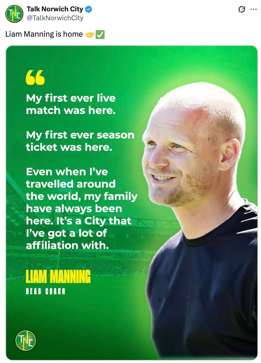 Valget falt altså på Liam Manning, en trener som tidligere har imponert med utviklingsorientert fotball og evne til å bygge strukturer over tid. Nå blir spørsmålet om han får arbeidsro og støtte til å gjøre nettopp det i et ambisiøst Norwich-lag som strengt tatt ikke er vant med å være en middelhavsfarer. Norwich er vant med både opprykk og nedrykk annen hver sesong, men de tre siste sesongene har gitt to 13. plasser og én 6. plass.